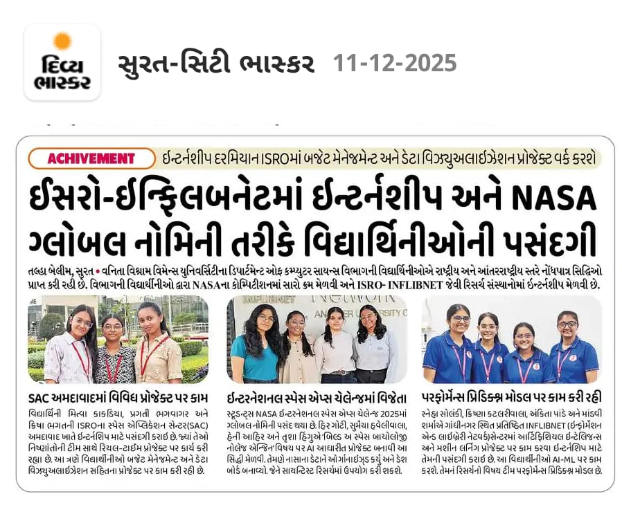 Team FOURmula One from Vanita Vishram Women’s University has been selected as a Global Nominee in the prestigious NASA International Space Apps Challenge 2025, placing their innovation among the top projects worldwide. The team—SY B. Sc. IT students Hir Goti, …