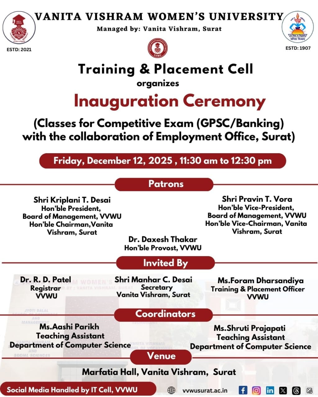 The Training and Placement cell of Vanita Vishram women’s University organized the inaugural ceremony of coaching classes for the preparation of Bank and GPSC exams under the Competitive Examination Training Assistance Scheme in collaboration with Employment Office, Surat (Government of …