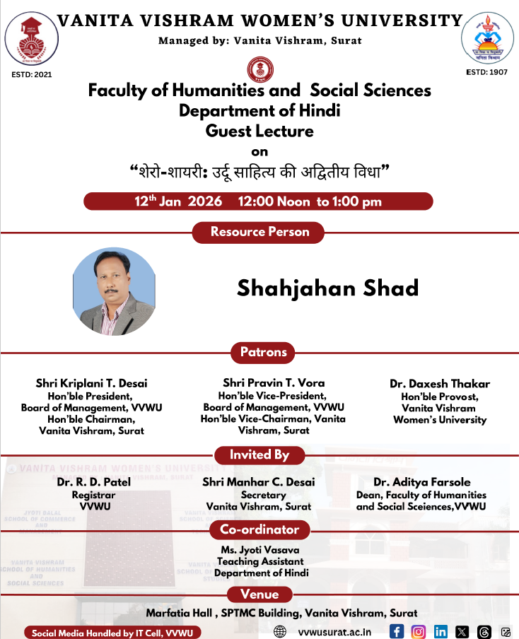 वनिता विश्राम द्वारा संचालित वनिता विश्राम विमेन्स यूनिवर्सिटी के हिंदी विभाग द्वारा दिनांक 12 जनवरी 2026 को दोपहर 12:00 बजे से 1:30 बजे तक ‘शेरो-शायरी: उर्दू साहित्य की अद्वितीय विधा’ शीर्षक के अंतर्गत एक विशेष व्याख्यान का आयोजन किया गया। …