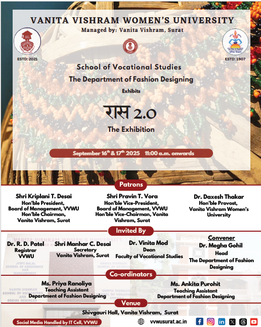 The Department of Fashion Designing, School of Vocational Studies, VVWU is delighted to invite you to our most awaited Annual Exhibition and celebration of National Handicraft Day – “रास 2.0”. Date: 16th & 17th September 2025 Time: 11:00 AM onwards …