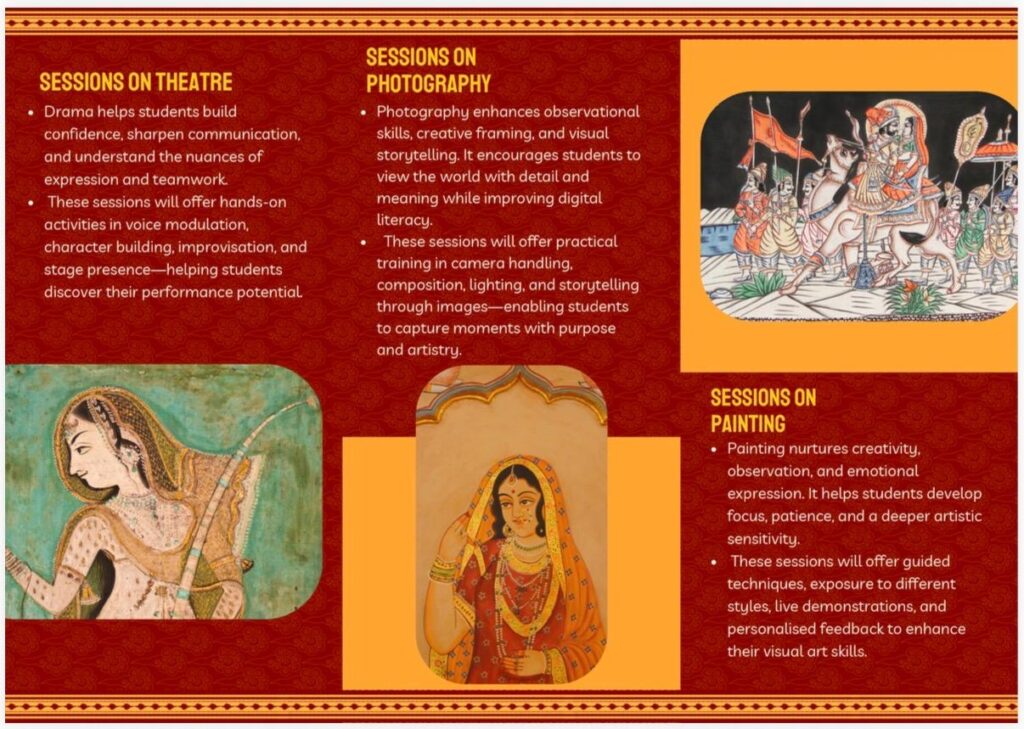 Participants will experience: 🎠DRAMA & THEATRE WORKSHOPS – Voice, expression, performance techniques, and stage dynamics. 🎨 PAINTING WORKSHOPS – Creative exploration through colours, materials, and forms (students to bring required materials). 📸 PHOTOGRAPHY WORKSHOPS – Framing, composition, concepts, and visual storytelling.