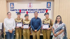 We are delighted to congratulate the cadets of Jyoti Dalal School of Commerce and Management, Vanita Vishram Women’s University, for securing Second Place in the Inter-College T-Shirt Designing Competition organized on the occasion of the 78th NCC Day on 22nd November 2025 at V.B. Shah College, Surat under the initiative of the 6 Gujarat Girls Battalion.
