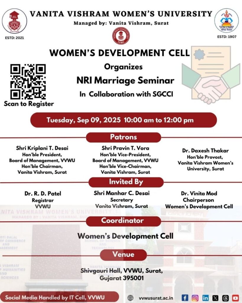 The Women’s Development Cell, Vanita Vishram Women’s University is organizing an Awareness seminar on NRI marriages in collaboration with The Southern Gujarat Chamber of Commerce and Industry (SGCCI), on the 9th of September, 2025 from 10.00 am to 12.00 pm at Shivgauri Hall, Vanita Vishram.