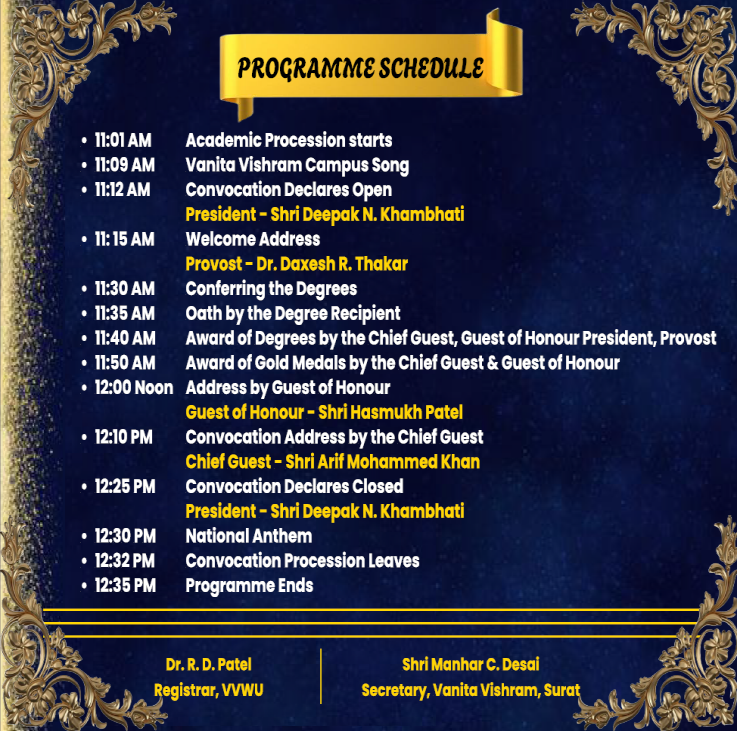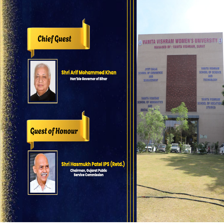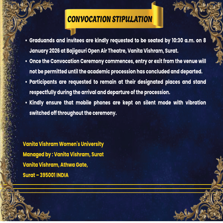 The Third Convocation of Vanita Vishram Women’s University, managed by Vanita Vishram, Surat will be held on 08-Jan-2025 at 11:00 am onwards at Bajigauiri Open Air Theatre, Vanita Vishram, Surat.